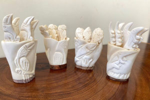 “Há toda uma preparação, os ossos são fervidos, fazemos uma higienização seguida por um processo de raspagem. Depois, o material fica de molho durante uma noite inteira, após isso, é lavado e exposto ao sol. Depois de seco ele toma forma e é aí que se inicia a produção da peça. Fazemos um desenho no osso e o cortamos com o auxílio de uma serra, só a partir disso é feita a lapidação”, esclareceu Edson.