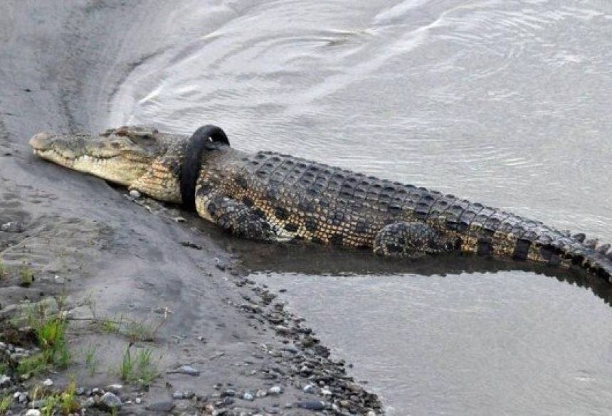 Autoridades oferecem recompensa a quem conseguir retirar pneu preso em crocodilo