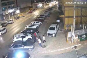 Câmeras de segurança registraram a ação. Por volta das 19h, um carro preto se aproximando do suspeito, que estava acompanhado de uma outra pessoa. O dono do comércio desce do veículo e já vai em direção ao assaltante desferindo golpes.